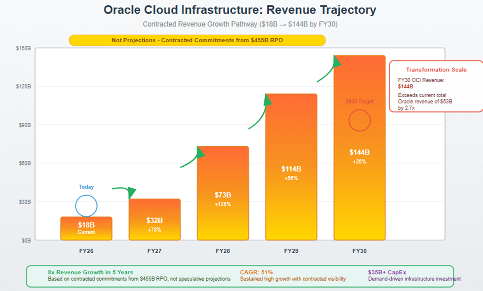 The execution challenge remains substantial. Oracle must build and deploy infrastructure equivalent to becoming one of the world's largest technology companies within five years. The projected OCI revenue growth from $18B in FY26 to $144B by FY30 requires scaling at a pace few companies have achieved.