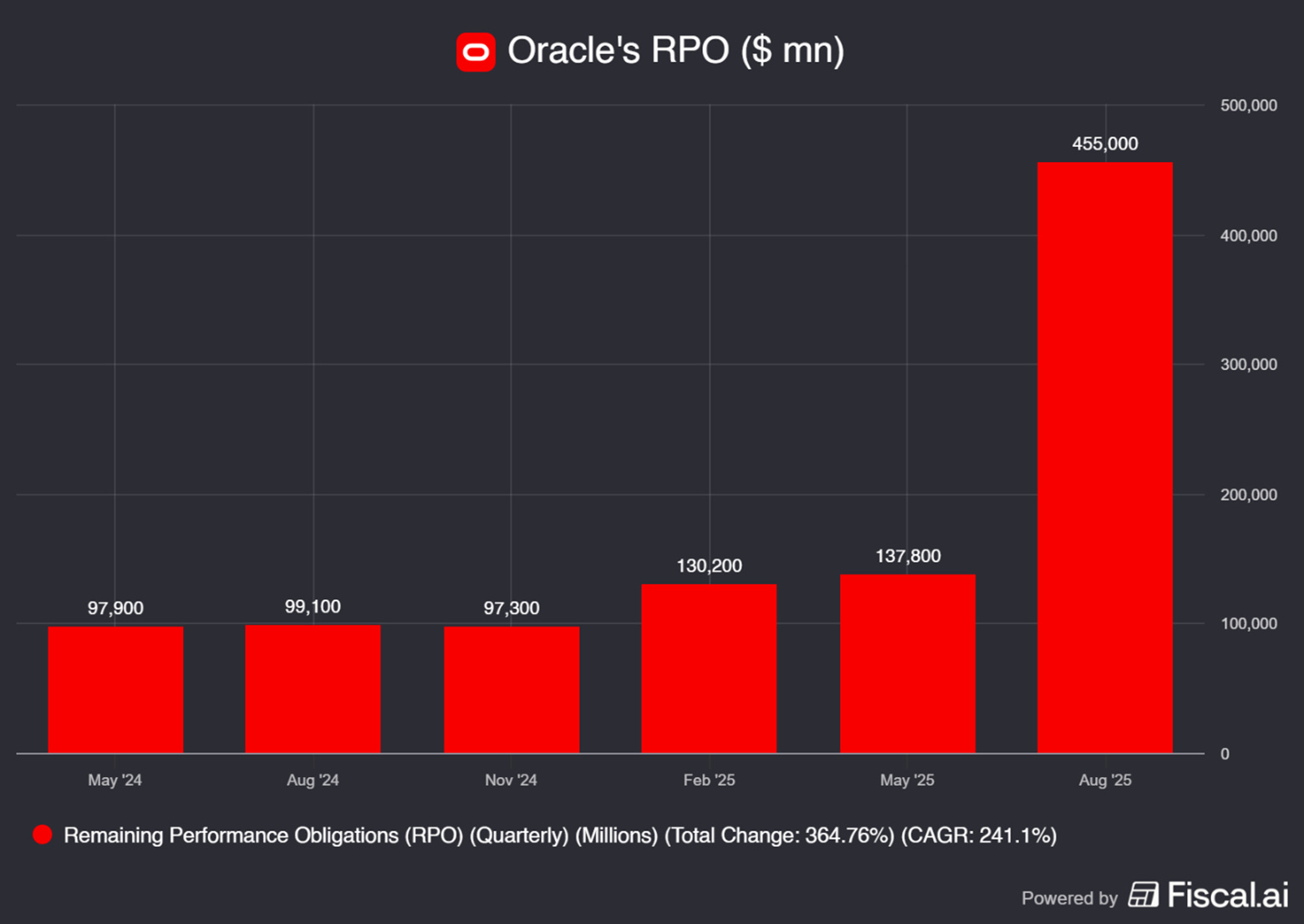 The company had technically missed revenue expectations ($14.9B vs $15.0B) and EPS guidance ($1.47 vs $1.481), but nobody cared about those numbers. Wall Street was focused on something unprecedented: Oracle's remaining performance obligations had exploded to $455 billion, representing contracted but unrecognized future revenue that dwarfed anything previously seen in enterprise technology.