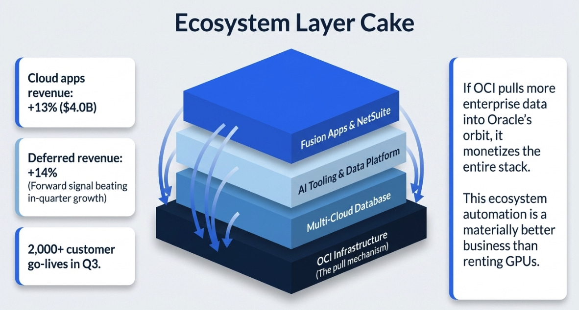Cloud applications revenue grew 13% to $4.0 billion. Fusion ERP grew 17%. NetSuite grew 14%. More tellingly, cloud applications deferred revenue grew 14% in constant currency, faster than in-quarter revenue growth of 11%, which is the forward signal most coverage skipped. More than 2,000 customer go-lives in the quarter. Management repeatedly framed these not as single-app wins but as “ecosystem automation” conversations combining OCI, AI Data Platform, Fusion Applications, industry suites, database, and AI tooling together.
