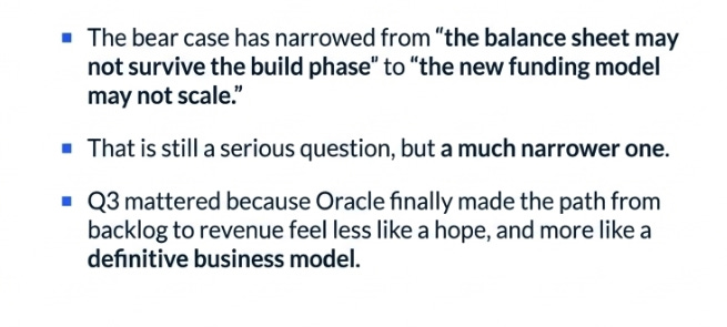 What we thought before was that Oracle had discovered a strategically privileged position in AI but risked letting capital intensity overwhelm the equity story. What we think now is that risk is still present, but Q3 is the first quarter where Oracle showed a believable way around it. The story is no longer simply “Oracle has huge demand.” It is now “Oracle may have found a way to keep the upside while outsourcing more of the funding burden.” That is a real change. The bear case has narrowed from “the balance sheet may not survive the build phase cleanly” to “the new funding model may not scale as broadly as management suggests.” That is still a serious question. But it is a much narrower one.