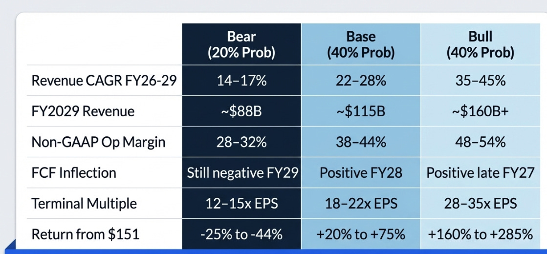 The base assumes BYOH becomes roughly 40% of new RPO, OCI sustains above 60% growth through FY2027 then moderates, multi-cloud database reaches $8-10 billion annualized by FY2029, and software margins expand 300-400 basis points from AI-driven R&D efficiency. This is a good business with a complicated balance sheet that slowly resolves. The re-rating is real but partial.