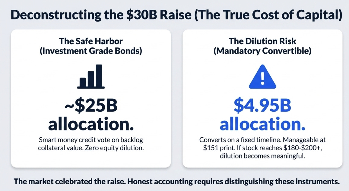 One financing detail deserves more attention than it has received. The $30 billion raise comprised two instruments that are not equivalent. The investment-grade bonds carry no dilution. The $4.95 billion mandatory convertible preferred stock will convert to common equity on a fixed timeline, regardless of stock price. At $151 heading into this print, the conversion terms are manageable. At $180-200+, the dilution becomes more meaningful. The market celebrated the oversubscribed raise without distinguishing between the two instruments. That distinction matters, and it belongs in any honest accounting of what the financing actually cost.