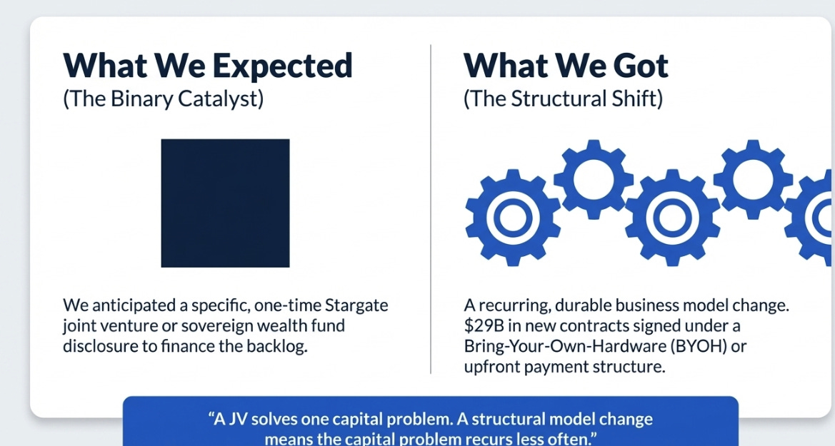 What we got wrong was the structure of the answer. We expected a one-time JV announcement. What Oracle revealed was a recurring business model shift: customers prepaying for capacity, or supplying their own GPUs, with Oracle providing the operating layer on top. That is more durable than a single financing event. A JV solves one capital problem. A structural model change means the capital problem recurs less often. We will take being wrong in that direction.