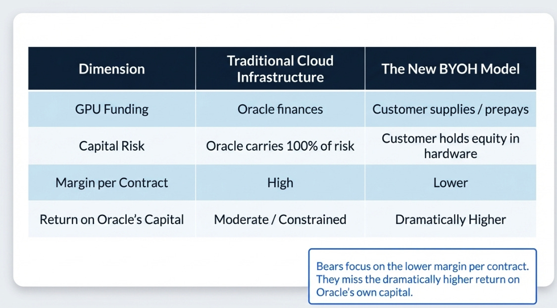 Think about what this means structurally. In the old model, Oracle finances the GPUs, builds the data center, sells cloud capacity, carries all the capital risk. In the new model, the customer supplies the GPUs, Oracle provides the facility, network, database, and software stack. The customer has equity in the hardware sitting inside Oracle’s building. Oracle captures the operating and software layer without deploying the most capital-intensive component. Lower margin per contract, but dramatically higher return on Oracle’s own capital. That distinction has not made it into consensus models, and it is the intellectual center of why Q3 represents an inflection rather than just an acceleration.