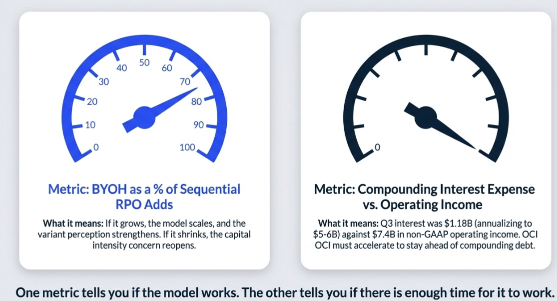 The single number that will tell us whether this thesis is holding is BYOH as a percentage of sequential RPO adds. If it grows quarter over quarter, the model is scaling and the variant is strengthening. If it shrinks, if Oracle reverts to self-funding incremental growth in Q4 or Q1 FY27, the capital intensity concern reopens immediately and the base case becomes the ceiling rather than the midpoint. The number that could quietly undermine everything else, regardless of BYOH trajectory, is interest expense. It doesn’t announce itself. It just compounds, quarter after quarter, against an operating income line that needs OCI to keep accelerating to stay ahead of it. Watch both numbers. One tells you whether the model is working. The other tells you whether there is enough time for the model to work before the balance sheet demands its answer.