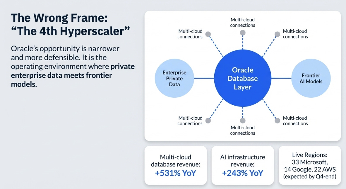 The market still frames Oracle as if the relevant question is whether it can become the fourth hyperscaler. That is the wrong frame. Oracle’s real opportunity is narrower, more strategic, and more defensible: the multi-cloud database layer, the enterprise data control point, and the operating environment where private data meets frontier models. Oracle is not building another AWS. It is building the place enterprises go when they want to use the best models without surrendering control of their most valuable data, where vector embeddings, MCP access, advanced security controls, and data co-located with agents are the requirements, not the differentiators. That is a use case Oracle’s architecture is unusually well aligned to serve, which is different from saying competitors cannot address it, but does suggest Oracle holds structural advantages that most coverage has underpriced.