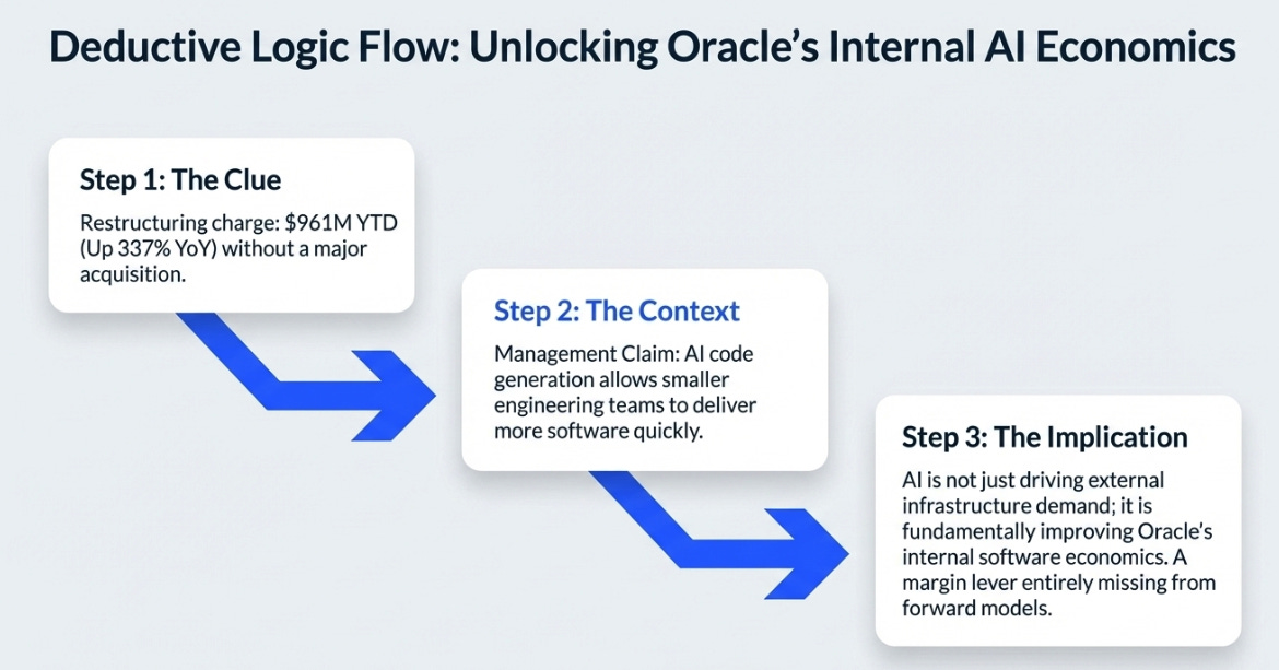 There is a second margin lever that one plausible reading of the numbers supports: Oracle’s restructuring charge is $961 million year-to-date, up 337% YoY, without a major acquisition to explain it. Management said AI code generation is allowing smaller engineering teams to deliver more software more quickly. If that is what is happening at scale, and the new product output this quarter is at least consistent with the claim, then AI may not just be driving Oracle’s infrastructure demand. It may also be improving Oracle’s own software economics in ways that don’t yet appear in any forward model. That is inference, not proof. But it is the kind of inference worth tracking.