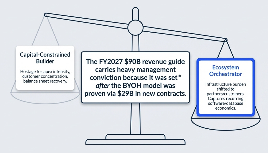 If BYOH scales: Oracle evolves from capital-constrained builder to AI infrastructure orchestrator, with backlog converting into revenue without the same balance-sheet strain.