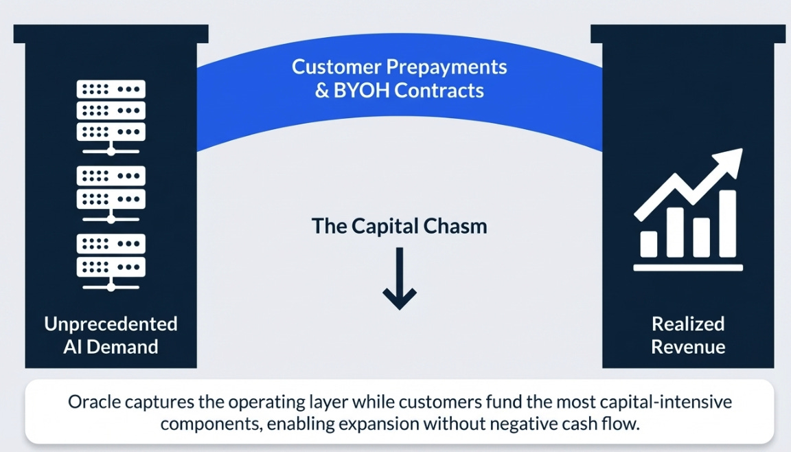 The real change was structural: large AI contracts increasingly use customer-funded GPUs or upfront prepayments, shifting capital intensity away from Oracle.