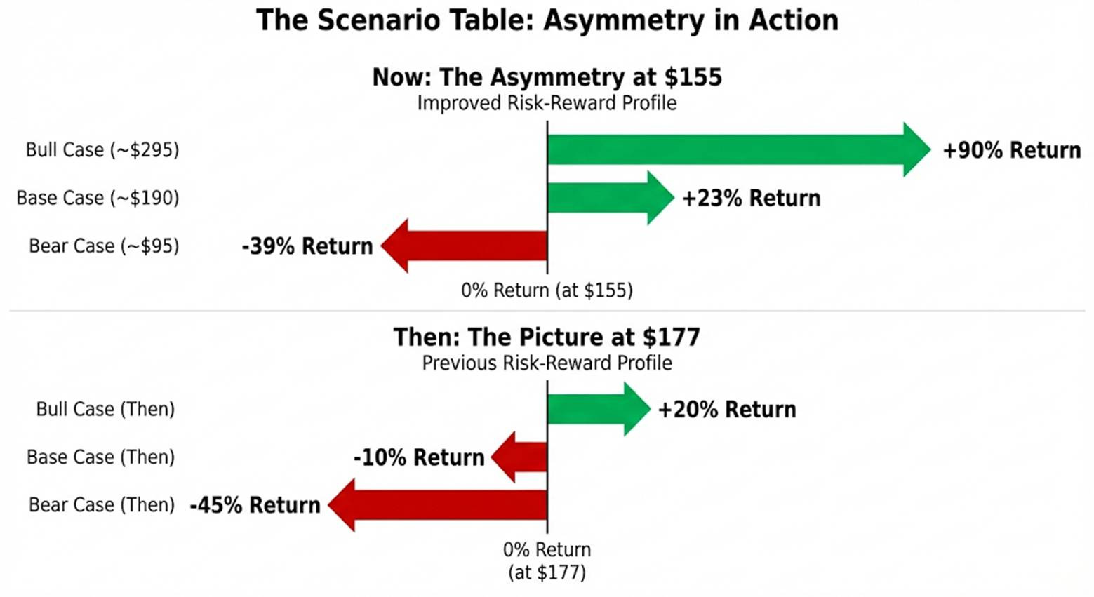 The asymmetry is what matters. Three months ago at $177, even the bull case offered only modest upside and the base case was a loss. Today at $155, the bull case offers roughly 90% upside and the base case, which represents what the company has already demonstrated, is positive at about 23%. You’re no longer paying for hope. You’re paying for demonstrated performance with meaningful optionality if the wiring compounds the way such systems historically have.