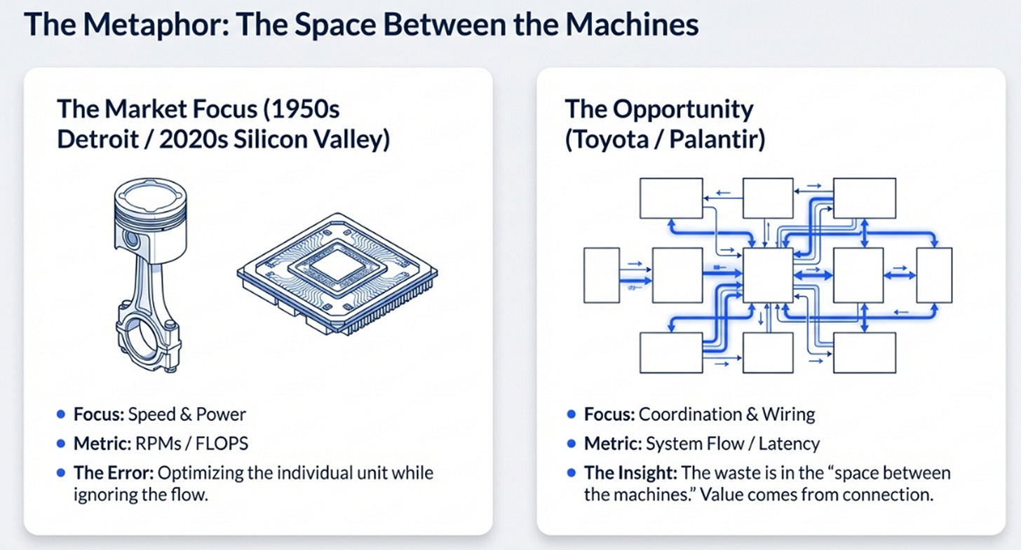 When American executives visited Toyota in the 1960s, they saw nothing proprietary. No breakthrough machine. No secret component. Just clean flows, simple cards, and obsessive attention to the connections between things. They left confused because they were looking for a faster machine. Palantir’s critics have spent twenty years making the same mistake, searching for a better model instead of better wiring.
