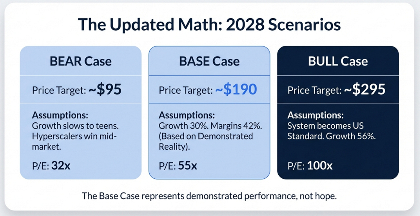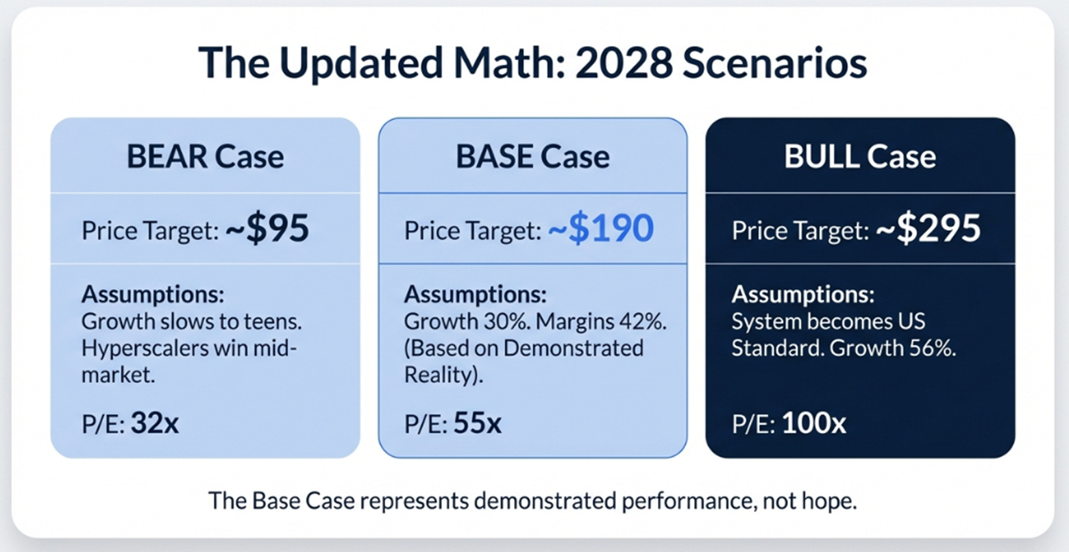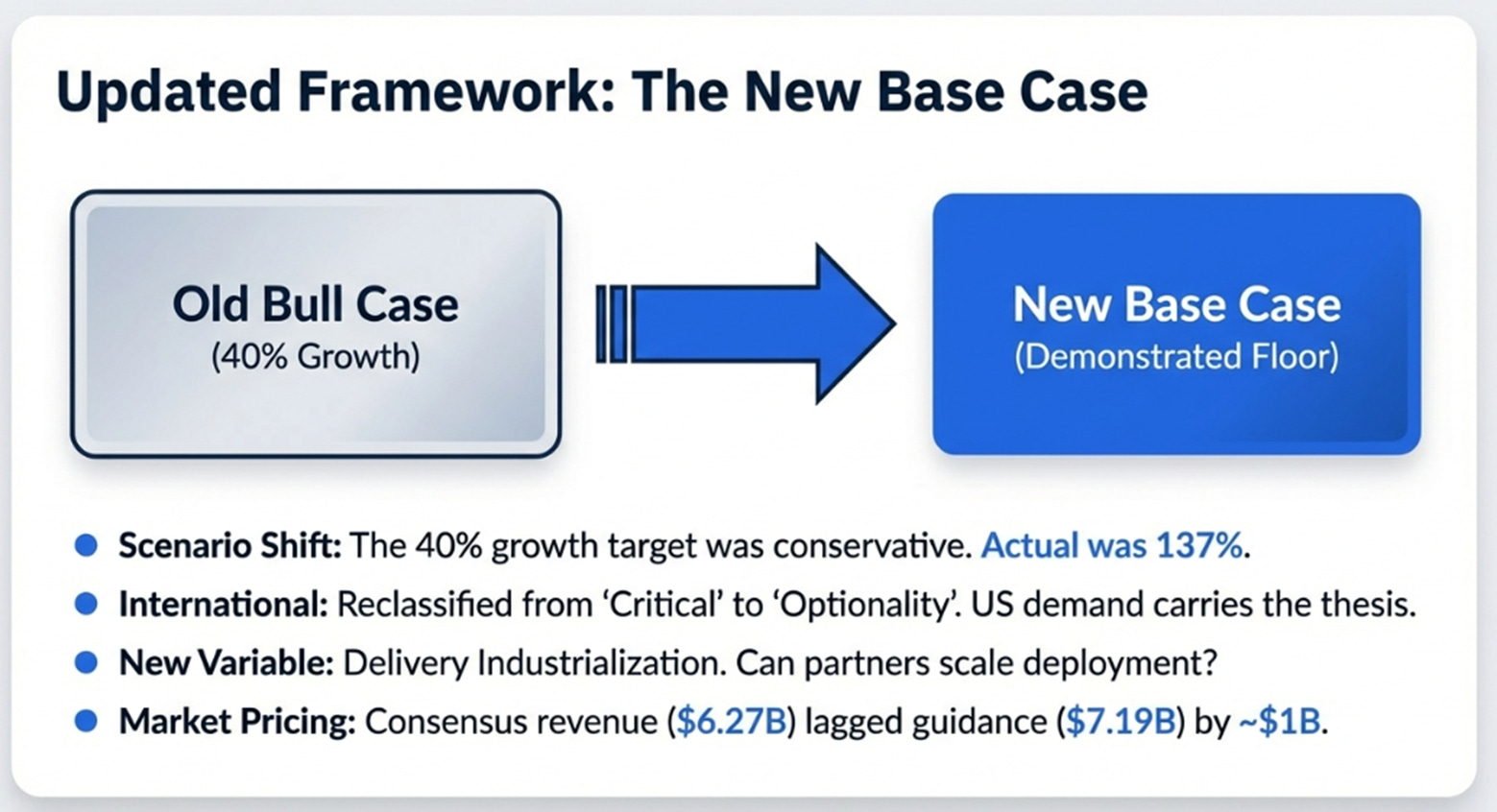 First, the old bull case is the new base case. My original bull case assumed 40%+ U.S. commercial growth and margins approaching 50%. The company delivered 137% growth and 57% margins and guided for 61% overall growth. The old optimistic ceiling is now the demonstrated floor. Each scenario shifts up one tier. This isn’t bullishness. It’s arithmetic.
