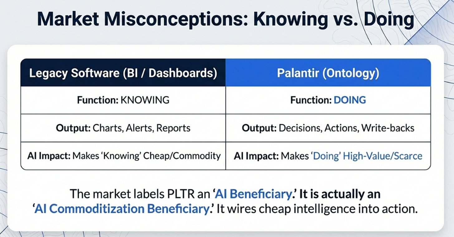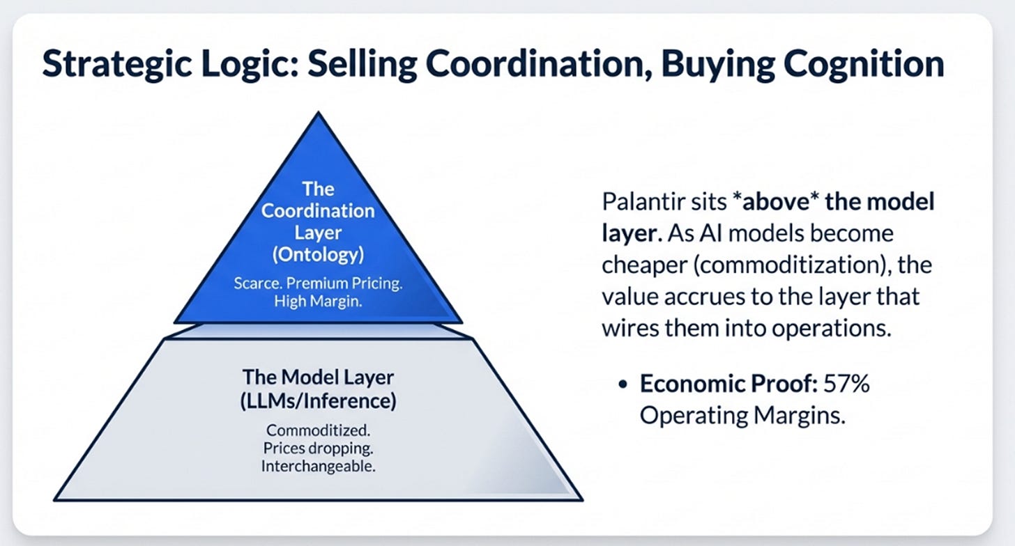 The first is categorical. “AI beneficiary” is the wrong label. Palantir benefits from AI commoditization, not AI advancement. If the AI bubble bursts and model companies implode, Palantir’s input costs decline while the operating system remains essential. The cheaper intelligence becomes, the more you need someone to wire it into operations.