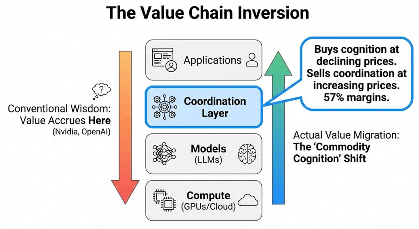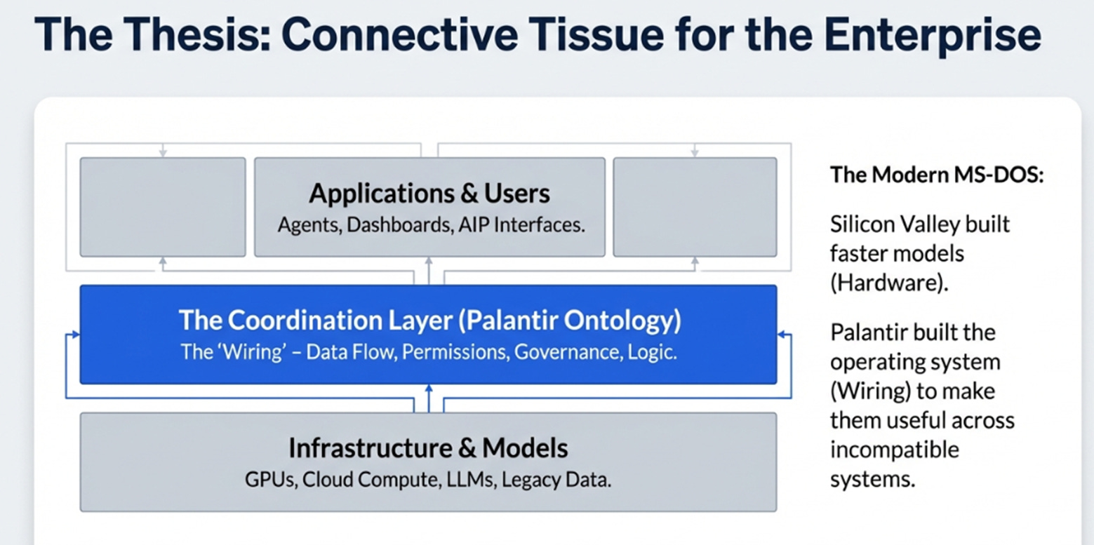 Palantir isn’t an AI application company; it’s an operating system for enterprise coordination, monetizing the space between systems as intelligence commoditizes.