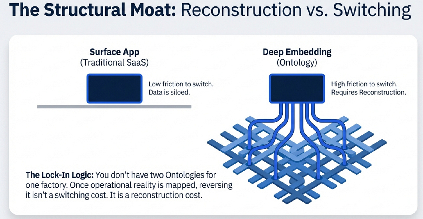 Once an Ontology is installed, there is no second one: switching costs become reconstruction costs, budgets consolidate, and Palantir captures the entire surface area of action.