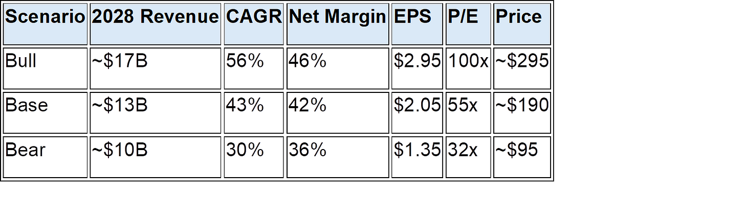 The base case is approximately $190. This is the old bull case, now confirmed as realistic. Growth decelerates from 61% to roughly 30% by 2028. Margins hold. Revenue reaches approximately $13 billion. At 42% net margins and 55 times, appropriate for 30% growth with elite profitability, earnings of about $2.05 per share produce a price near $190.