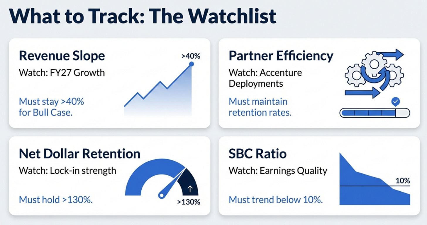 The new swing variable is the Accenture partnership. Track whether partner-led deployments achieve similar expansion and net dollar retention as direct deployments. If they do, the human-capital ceiling breaks. If they don’t, demand alone can’t solve the scaling problem.