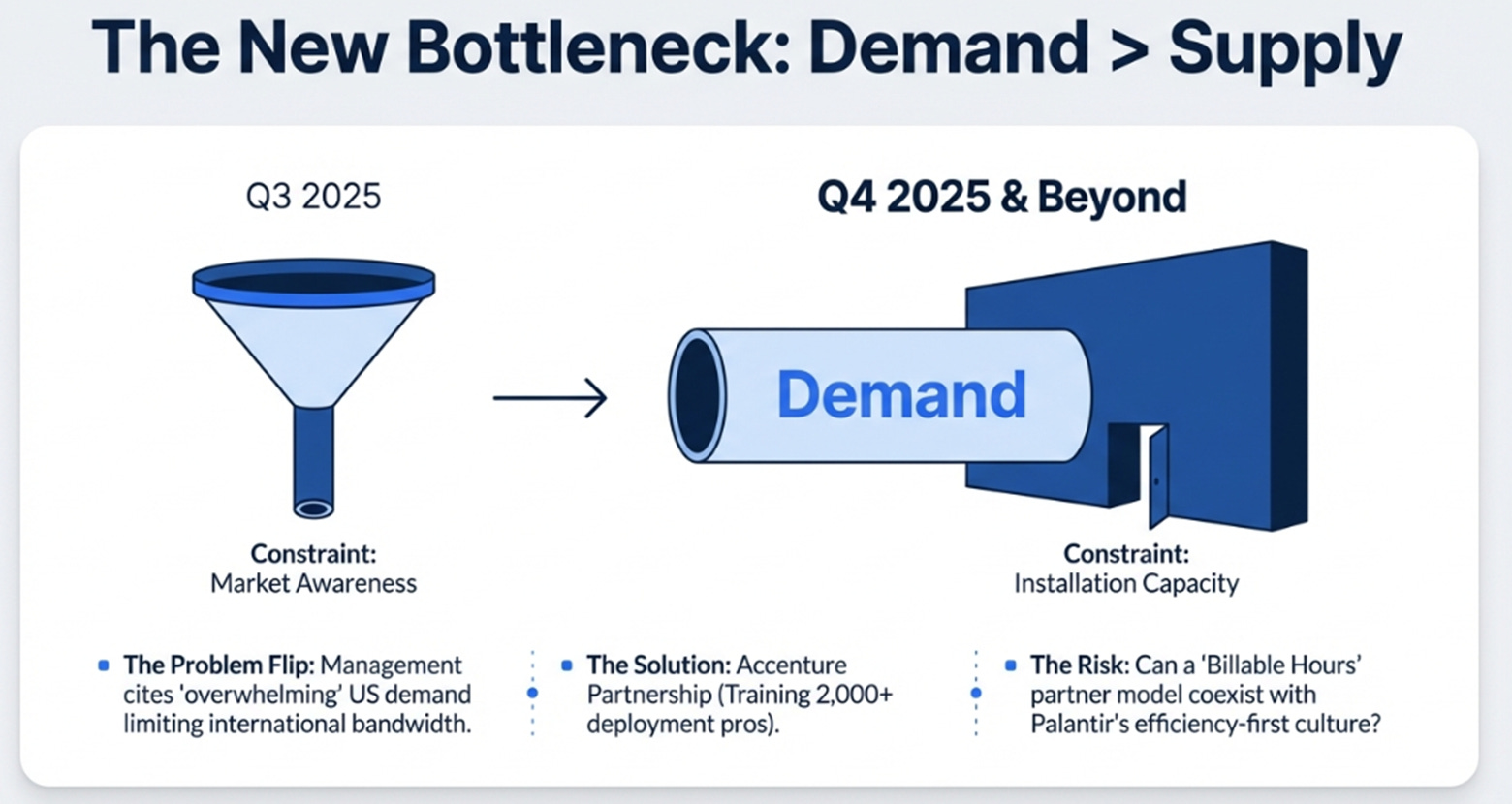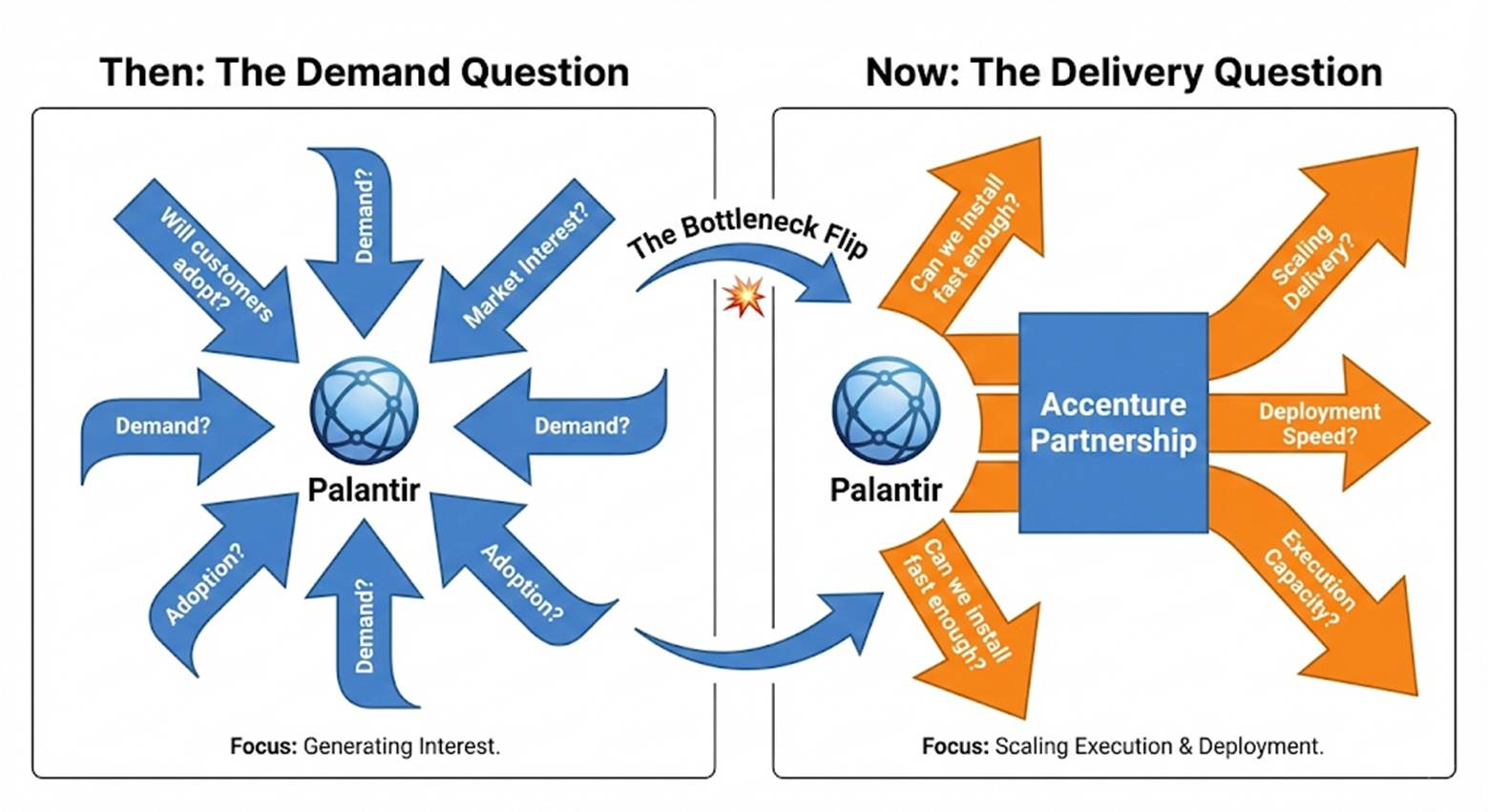 The original article focused on demand-side questions, will customers adopt? Will growth sustain? Q4 reframes the question entirely. The bottleneck has flipped. Karp essentially told investors that Palantir lacks bandwidth to serve international markets because U.S. demand is overwhelming. The Accenture partnership, training over two thousand professionals to scale deployments, is the clearest signal that the constraint has moved from “do people want this?” to “can we install it fast enough?” This is a better class of problem. It’s also a new condition to track, and it carries a specific tension: Accenture’s economics reward billable hours while Palantir’s reward efficient deployment. Whether those incentives can coexist without degrading quality will determine if the scaling constraint actually breaks.