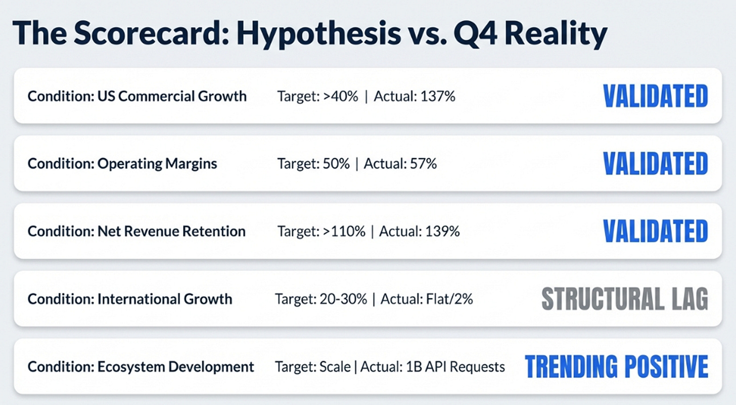 Several conditions from the original article have been answered. U.S. commercial growth above 40%, answered at 137%. Margins toward 50%, answered at 57%. The operating system thesis gaining traction, answered by a customer on the record.