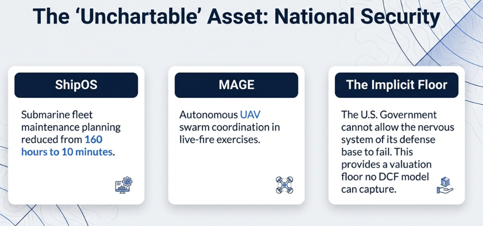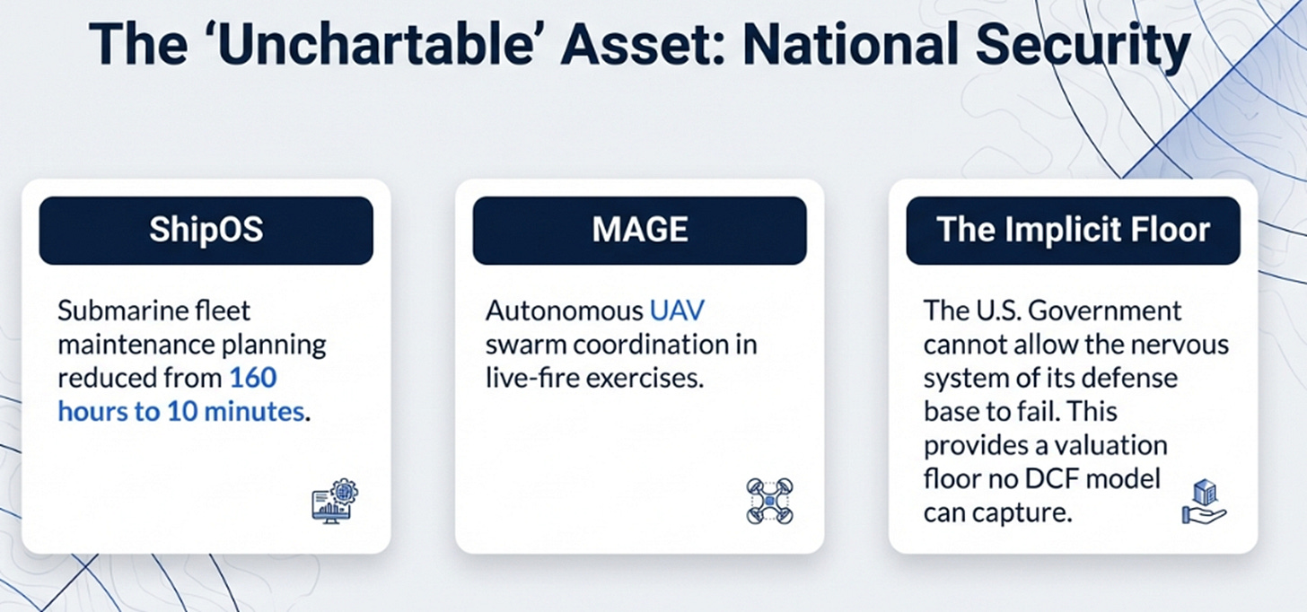 But look at what this actually means: Palantir may be building the most important company in the Western defense industrial base, and the market is pricing it as a software company. If U.S.-China tensions continue escalating, Palantir’s defense position becomes not just a business but a strategic national asset. That’s unchartable on a DCF model. The U.S. government doesn’t allow the nervous system of its submarine production and battlefield coordination to go bankrupt, lose relevance, or fall into foreign hands. That’s an implicit floor that no financial model captures, and it could ultimately matter more than the commercial story.