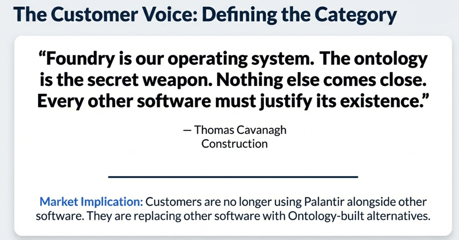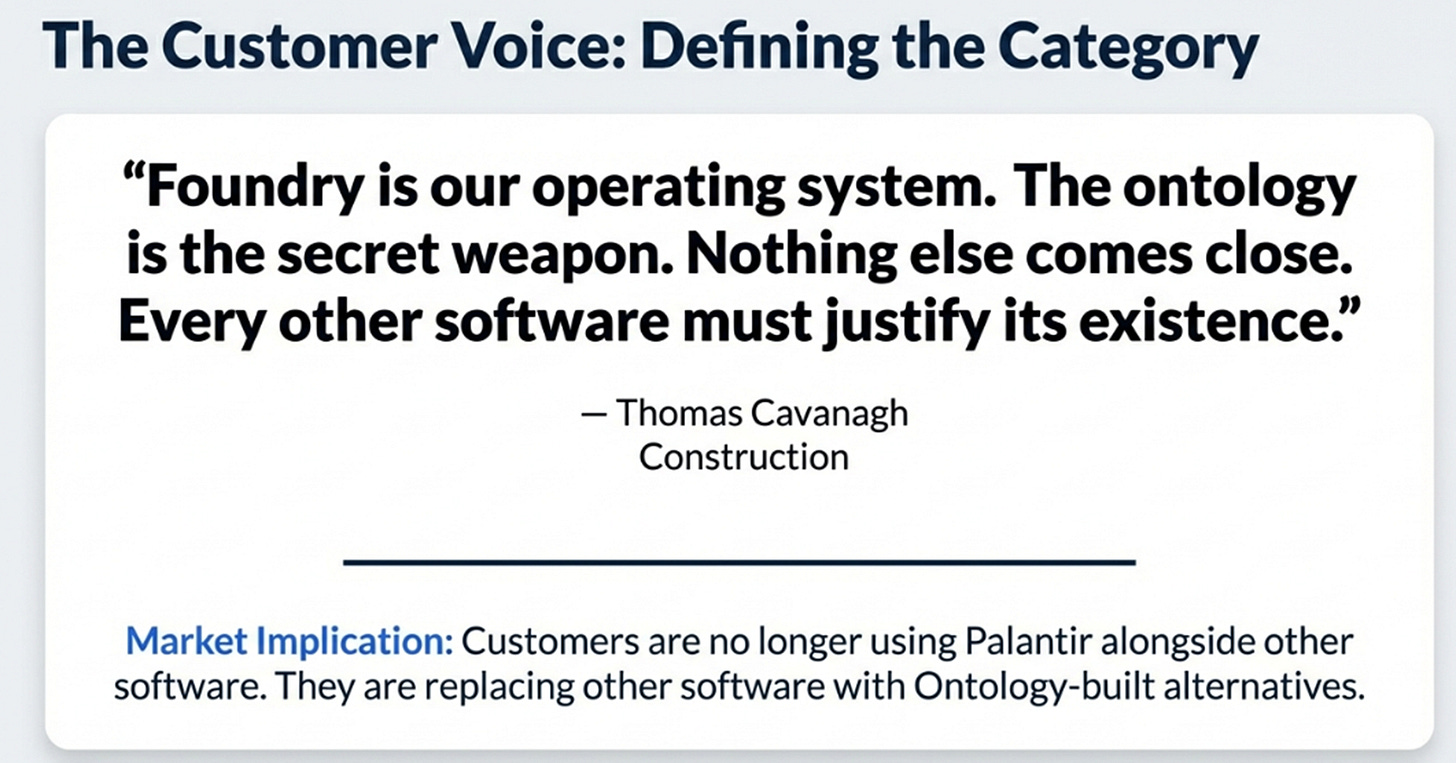 The most striking moment in the earnings call wasn’t a financial metric. It was a customer quote. The Ontology, Palantir’s living map that translates a company’s messy reality of legacy systems, sensor data, and human approvals into a single, governable digital structure, has always been difficult to explain on a slide. Thomas Cavanagh Construction made it concrete, unprompted: “Foundry is our operating system. The ontology is the secret weapon. Nothing else comes close. Every other software must justify its existence.“ When your analytical framework starts coming out of customers’ mouths, that isn’t confirmation bias. That’s the market adopting the category you described.