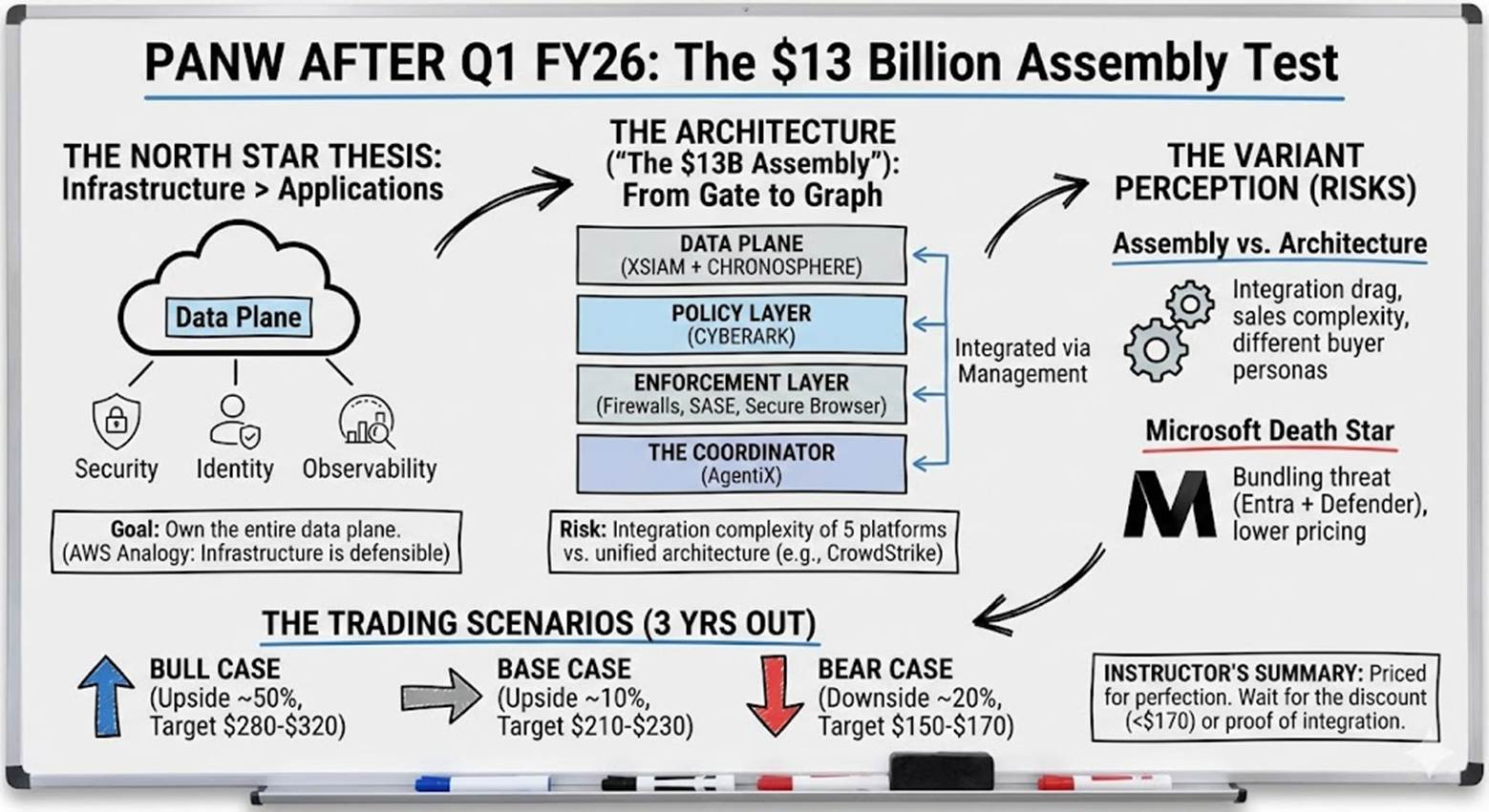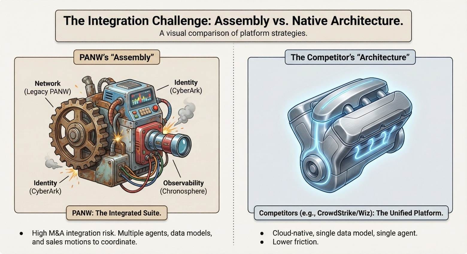 The strategic logic was clear. The execution risk was equally clear: PANW was attempting to coordinate multiple billion-dollar platforms—network security, cloud security, security operations, and identity—through management and process, not through a single unified architecture like CrowdStrike’s Falcon agent or Wiz’s cloud-native platform. I called this the “assembly versus architecture” tension, and suggested the market was underpricing the integration complexity while overpricing the upside at roughly 50x forward earnings.