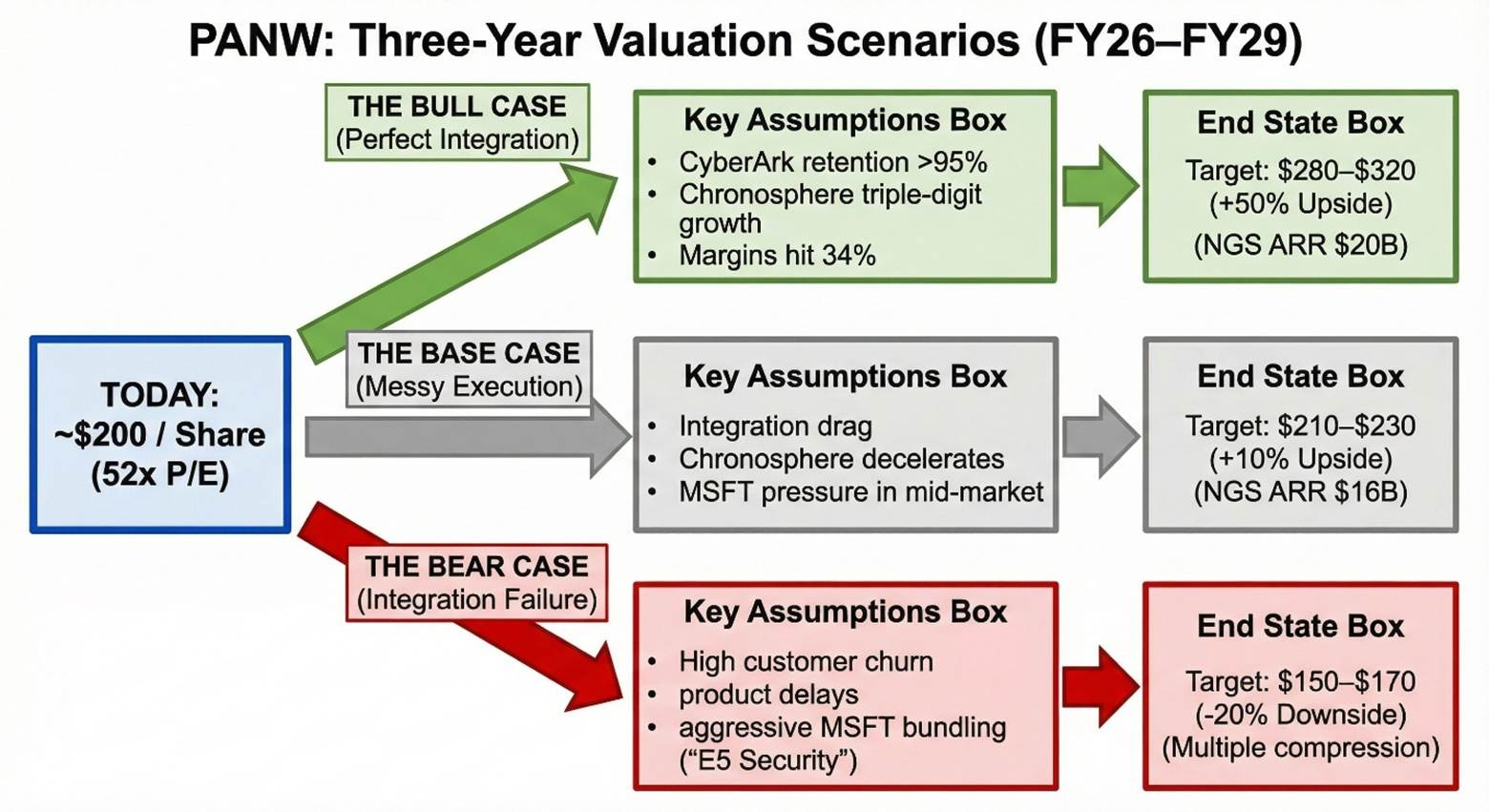 The bear case is straightforward: integration fails. Either CyberArk or Chronosphere customer churn exceeds 10% in the first year post-close, product integration takes 30 months instead of 18, NGS ARR growth decelerates below 20%, and Microsoft launches an aggressive “E5 Security” bundle that undercuts PANW by half in the mid-market. Revenue growth slows to 9-10%, operating margins compress to 27-28% under integration costs and competitive pricing pressure, free cash flow margins fall short of 40%, and multiples normalize to the mid-20s for legacy security vendors. That puts the stock at $150-170 in three years.