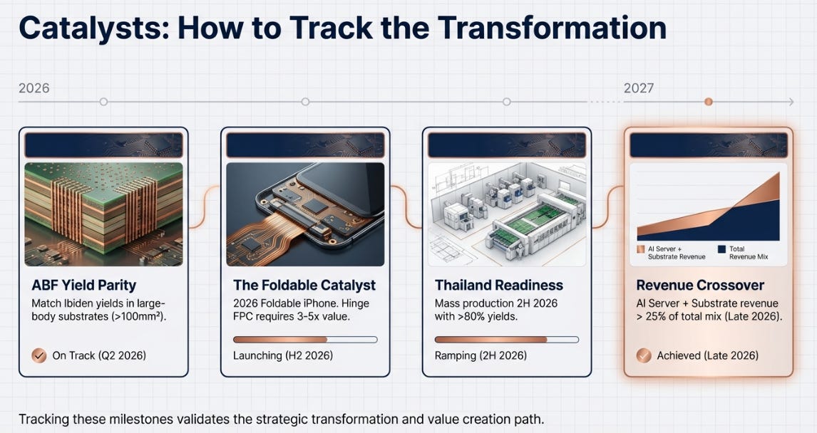 Revenue Mix Crossover: The quarter when AI Server + IC Substrate revenue exceeds 25% of total will be the inflection point. At that moment, the narrative becomes undeniable. Current trajectory suggests this happens in late 2026 or early 2027.