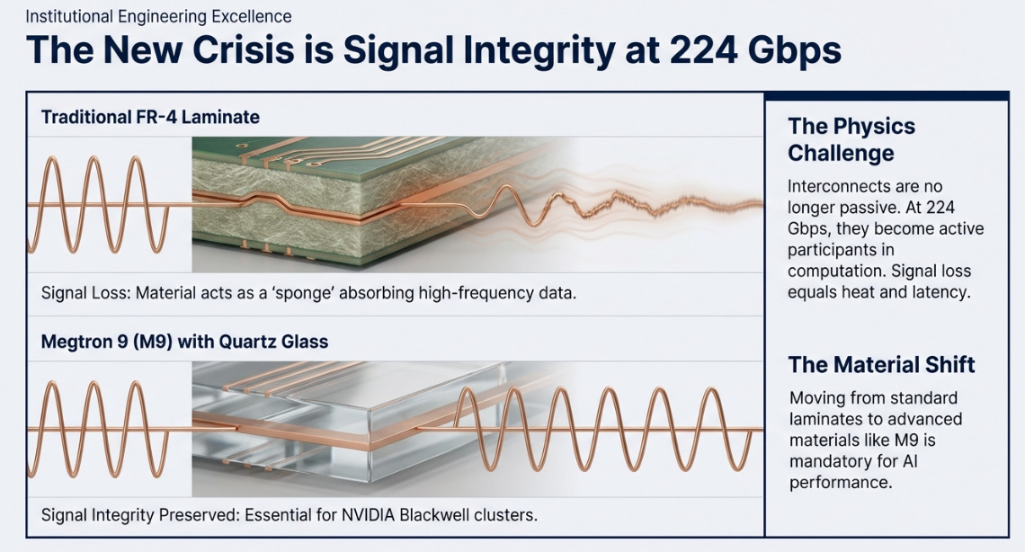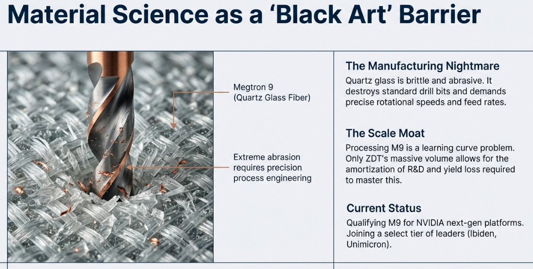 The transition to 224G signaling is fundamentally a material science problem. Traditional FR-4 laminate acts like a sponge at these frequencies, absorbing signals and converting them to heat. The solution is Megtron 9 (M9), a material using quartz glass fiber that maintains signal integrity but introduces a manufacturing nightmare. Quartz is brittle, abrasive, and destroys standard drill bits. Mastering its processing requires a different level of process engineering, what the industry calls “black art.”