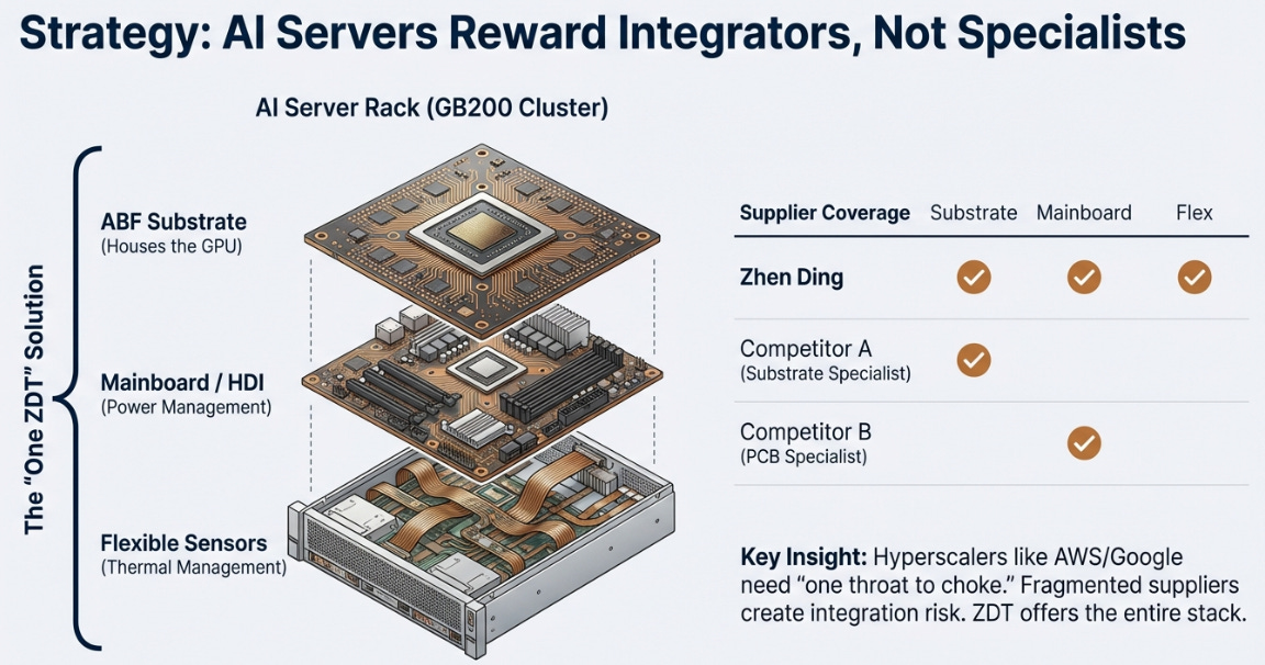 This matters because the AI server market doesn't reward specialists, it rewards integrators. When a hyperscaler like AWS designs a GB200 cluster, they need more than just a 78-layer server board. They need the ABF substrate that houses the GPU, the HDI boards for power management, and the flexible circuits for thermal sensors. Fragmented suppliers create fragmented risk. Zhen Ding offers a single throat to choke, and that's sticky in a way specialized competitors can't replicate.