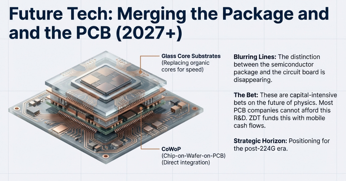 Looking further out, Zhen Ding is exploring Glass Core Substrates and CoWoP (Chip-on-Wafer-on-PCB), technologies that could merge the circuit board with the semiconductor package itself. These aren't incremental improvements, they're bets on a future where the distinction between substrate and board disappears. Most PCB companies can't afford these bets. Zhen Ding can, because its legacy business prints cash.