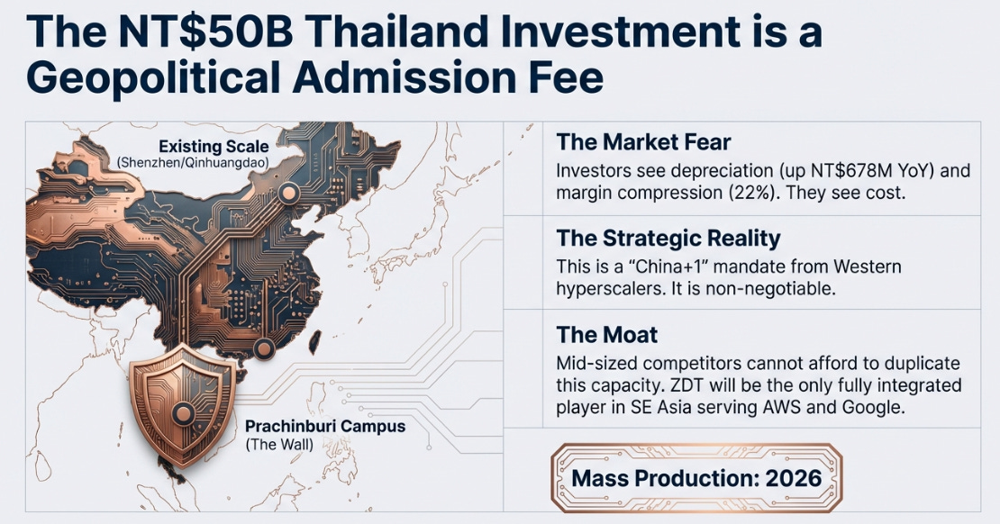 Technical brilliance alone isn’t sufficient in this decade. Success requires a geopolitical insurance policy, and that insurance isn’t cheap. Zhen Ding’s NT$50+ billion investment in its Thailand facility, scheduled for mass production in 2026, is the entry fee for remaining a global player. Western hyperscalers and automotive OEMs have made “China+1” sourcing mandates non-negotiable.
