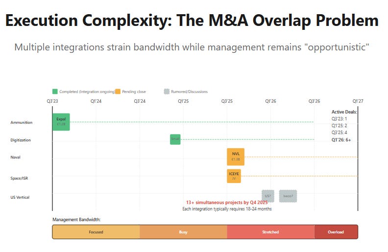 When asked about M&A discipline, Papperger responded that “we remain opportunistic. With our stock price and strategic position, we’d consider larger deals if they make sense.” This isn’t a framework—it’s deal addiction. The appropriate response would establish clear boundaries: pausing M&A at 2.0x net debt/EBITDA or committing to no acquisitions until naval integration is complete and free cash flow normalized. Great acquirers often struggle most with knowing when to stop acquiring.