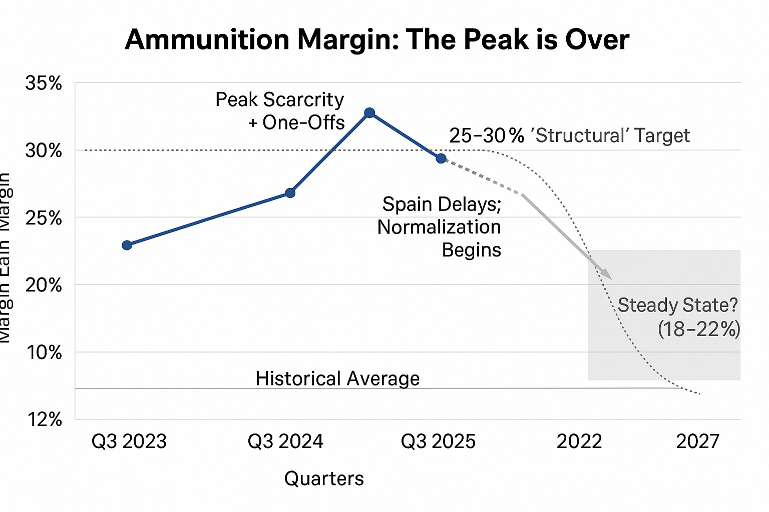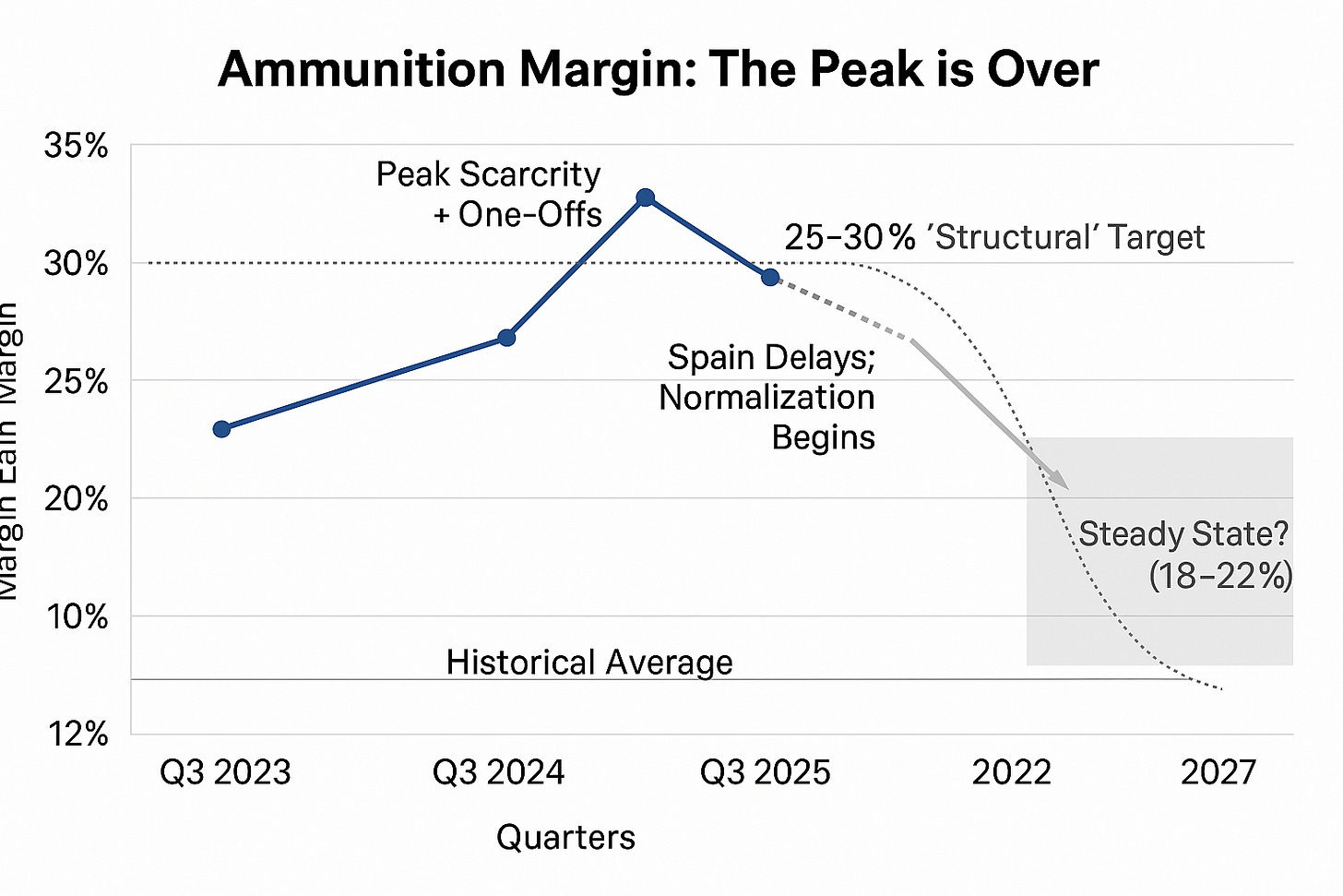 What he’s really communicating is that this friction is temporary and investors should trust the 25-30% structural target. What the data actually reveals is scarcity rent evaporating. When you lose 330 basis points during peak demand shortage—before KNDS, BAE, and Hanwha bring competitive capacity online—the steady-state margin structure is revealing itself early.