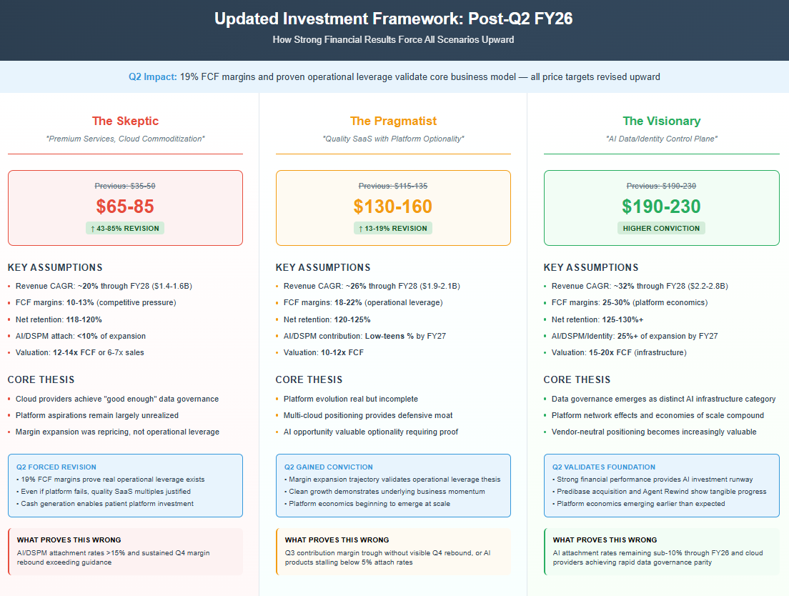 The Q2 results force a fundamental recalibration of all three investment scenarios. Every framework must now acknowledge that the core cyber resilience business is profitable, growing, and generating substantial cash flow. The debate has shifted from "can they build a sustainable business" to "how big can that business become."