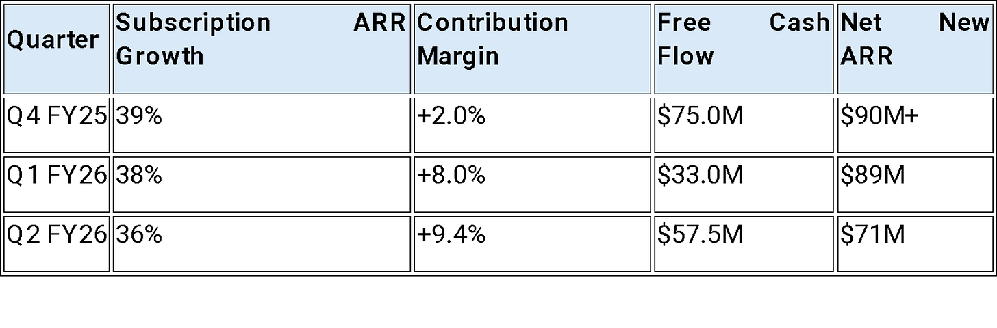 The more important signal is the 19% free cash flow margin ($57.5 million), driven by subscription ARR contribution margins expanding from -8.2% to +9.4% year-over-year. CFO Kiran Chaudhry helpfully detailed what drove this performance: stronger ARR, genuine margin improvement, capital structure optimization, favorable contract duration, and early renewals. Notice what's in that list—actual operational leverage, not just financial engineering.