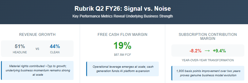 Core business proven: Q2's 19% FCF margins and 44% clean growth (ex-one-time factors) demonstrate Rubrik's cyber resilience platform generates sustainable cash flow to fund AI expansion