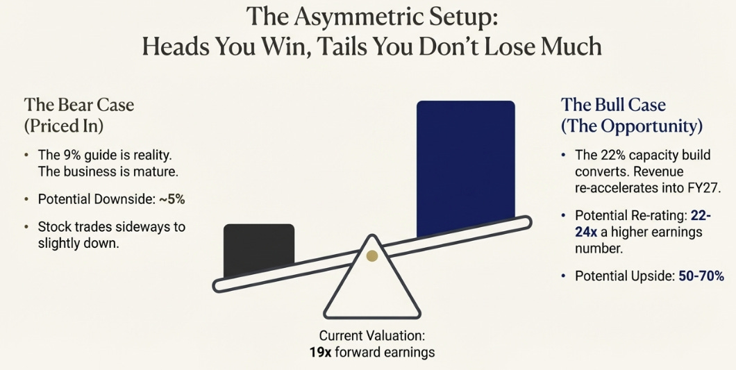 At 19 times forward earnings, the market prices the bear case: perpetual 9% growth, mature business, bond-like characteristics. If that’s right, the stock trades sideways to down slightly. You lose maybe 5%.