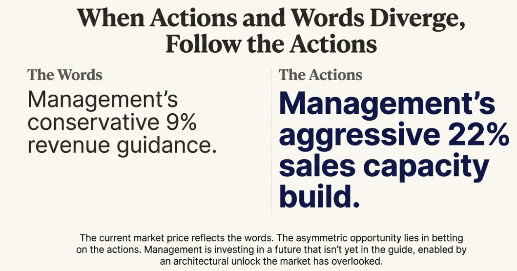 One of these numbers is wrong. Either the capacity investment is a mistake and margins will compress as excess reps underperform, or the guide is conservative and revenue will re-accelerate as the new capacity comes online.