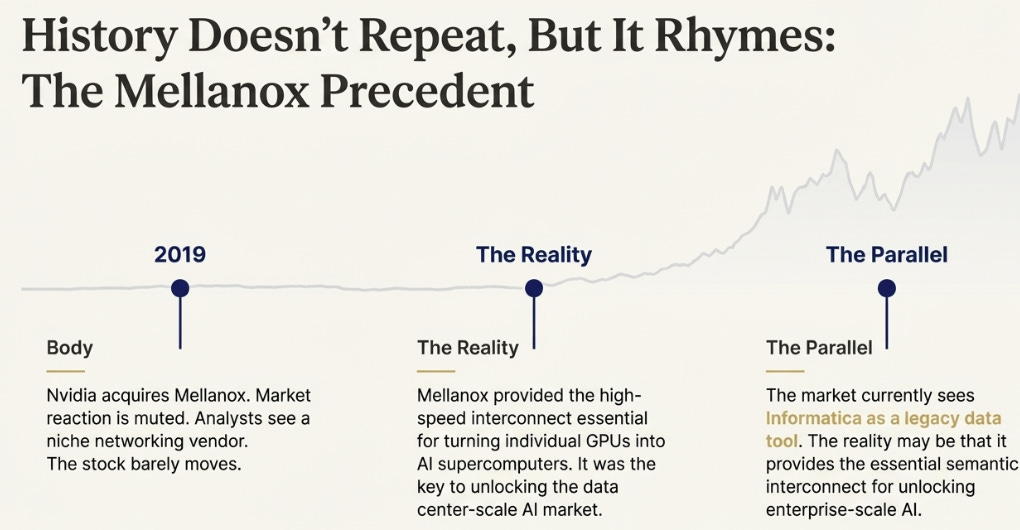 The Mellanox parallel is worth dwelling on for a moment, because it illustrates how markets systematically misprice infrastructure acquisitions.