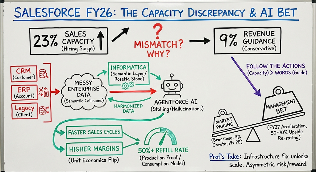 This is why Salesforce can suddenly hire 22% more salespeople. The deals are finally profitable at scale. The architecture constraint that prevented aggressive investment in FY24-25 is gone.