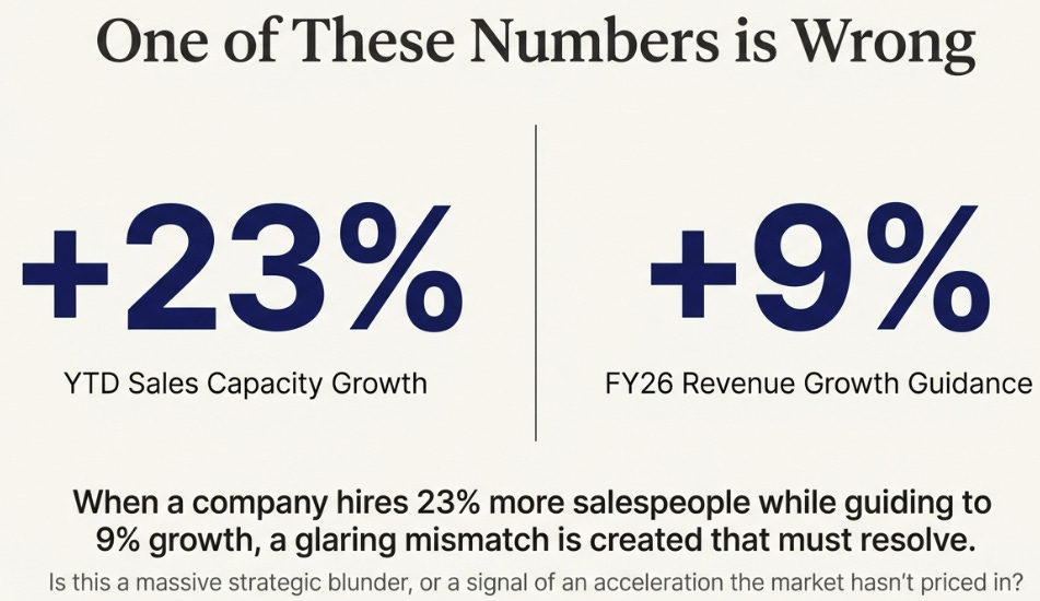 When a company hires 23% more salespeople while guiding to 9% growth, one of those numbers is wrong.