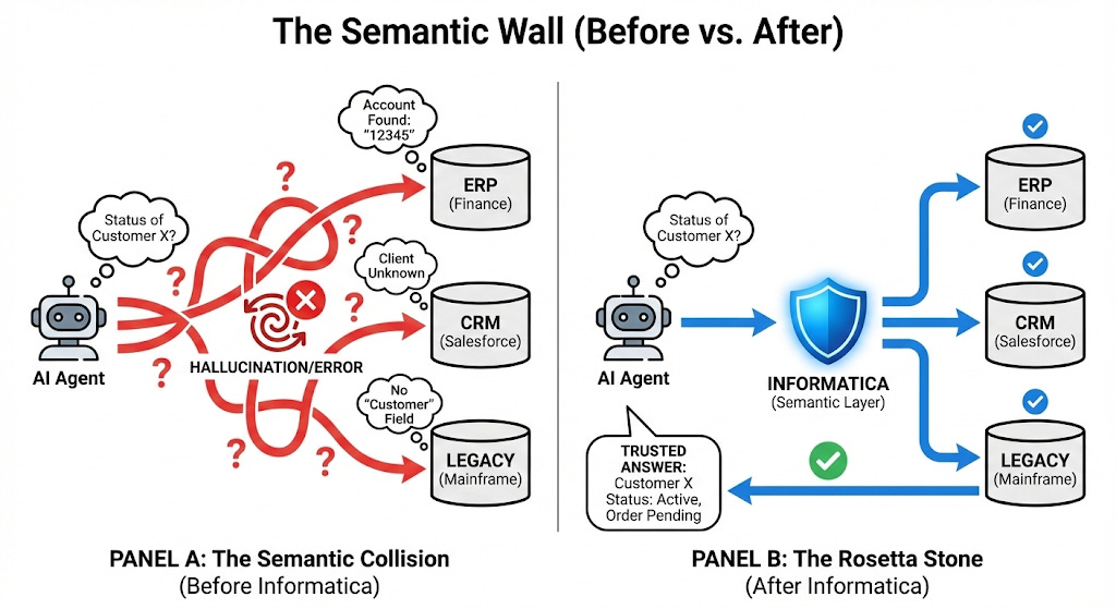 When an AI agent tries to answer a question that spans these systems — “What’s the status of Customer X’s order?” — it runs into semantic collisions. The agent can query each system, but it can’t reconcile the conflicting definitions. It doesn’t know that “Account” in one system refers to the same entity as “Customer” in another. Faced with ambiguity, it either hallucinates a confident answer, freezes entirely, or returns results that are subtly wrong in ways that destroy trust.