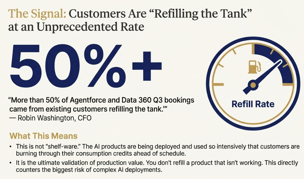 Early proof is showing up in refill rates and consumption growth, suggesting Salesforce is preparing for FY27 acceleration the market hasn’t priced in.