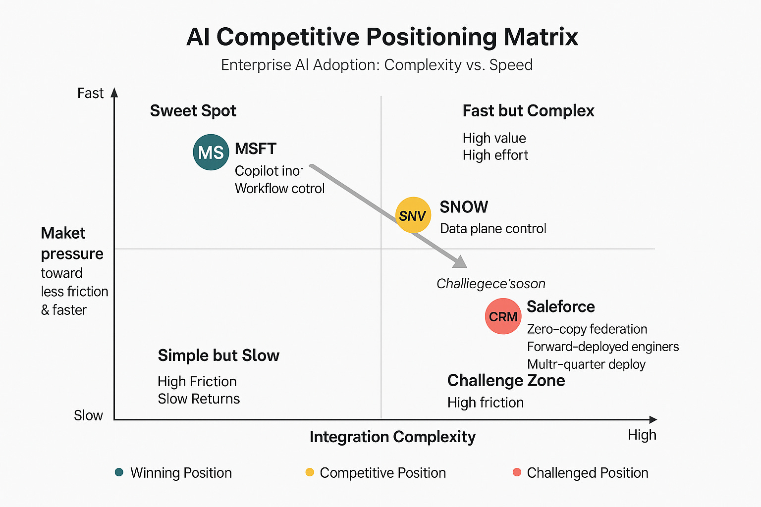 Competitive Timing Gap: While ServiceNow grows 20% with immediate AI monetization and Microsoft embeds Copilot in 400M+ daily users, Salesforce is stuck integrating fragmented systems requiring "forward-deployed engineers" for each AI deployment
