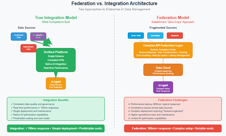 True platform integration would mean migrating customer data into unified schemas, establishing consistent governance policies, and providing seamless user experiences across all applications. Instead, zero-copy federation allows data to remain in existing systems while providing API-based access for AI applications. This approach reduces migration complexity but sacrifices the performance and consistency advantages of integrated platforms.