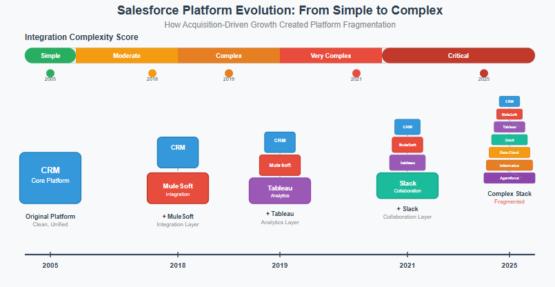 But every acquisition also added architectural fragmentation. Each product came with its own data models, user interfaces, administrative frameworks, and integration requirements. What emerged wasn't a unified platform but a collection of powerful applications held together by marketing frameworks and pricing bundles. "Customer 360" became a brand promise rather than a technical reality.