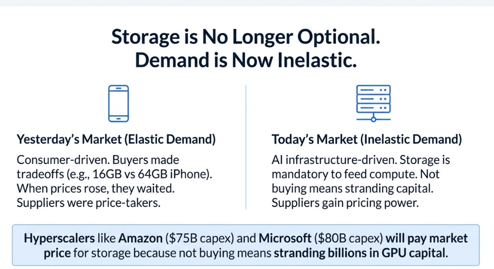 Historically, NAND demand was textbook elastic. When iPhones came in 16GB or 64GB versions, consumers made tradeoffs. When prices fell, they upgraded. When prices rose, they waited. This elasticity meant NAND suppliers were perpetual price-takers—no matter how good their technology, they couldn’t capture value.