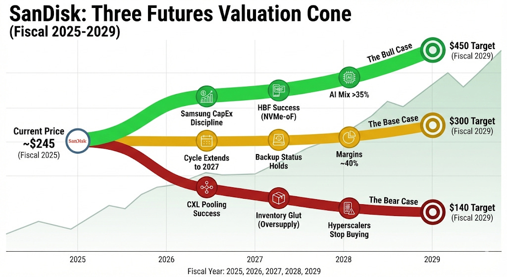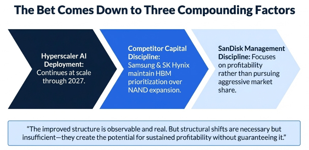 The bet on SanDisk comes down to three compounding factors: continued hyperscaler AI deployment through 2027, Samsung and SK Hynix maintaining HBM prioritization over NAND capacity expansion, and SanDisk management maintaining capital discipline rather than pursuing market share through aggressive investment. If all three prove true, the bull scenario becomes plausible. If two hold, base case delivers acceptable returns. If one or zero, bear case becomes reality.