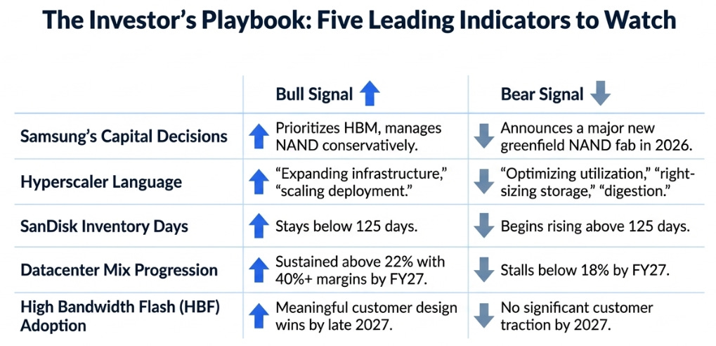 The warning signal isn’t financial results—it’s language. When Microsoft or Amazon discuss “right-sizing storage” or “optimization” rather than “expanding capacity,” procurement is about to dry up. Investors who wait for SanDisk’s earnings to reflect weakness will be too late.